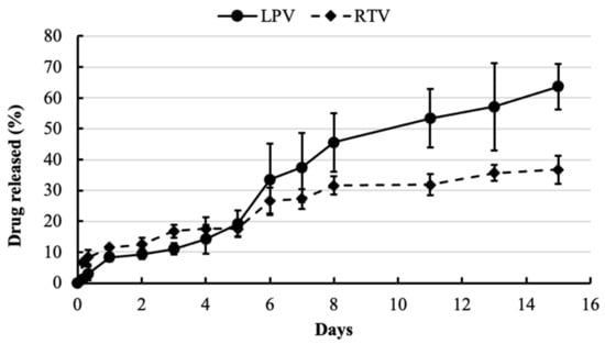 Release of LPV and RTV from the ISNP-based LPV-RTV injection in a simulated physiological condition. The study was performed in PBS (pH 7.4) at 37 °C for 15 days. Released LPV and RTV were measured by HPLC. Data are presented as the mean ± SD (n = 4).