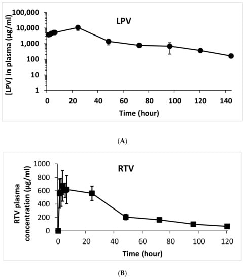 Pharmacokinetic parameters (Cmax, Tmax, T1/2, and AUC0-∞) of LPV and RTV were analyzed using noncompartmental analysis methods using Phoenix WinNonlin version 8.0 (Certara USA, Inc., Princeton, NJ, USA).