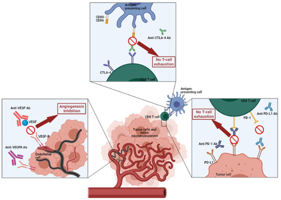Several types of Abs are currently used for the treatment of NSCLC, but this review will discuss ICI and anti-angiogenic Abs. In fact, some Abs are directed to the epidermal growth factor receptor (EGFR), such as necitumumab, a monoclonal antibody (Ab) which blocks the interaction between EGFR and its ligands. It was approved by the Food and Drug Administration (FDA) in 2015 for first-line treatment of metastatic squamous NSCLC in combination with chemotherapy [3] but the National Comprehensive Cancer Network (NCCN) guidelines recommend against the use of this Ab, based on its toxicity, cost, and limited improvement in efficacy when compared to chemotherapy.