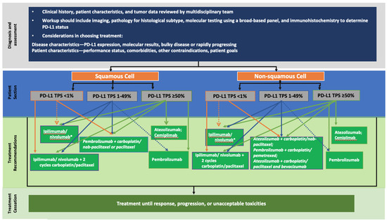 In the front line setting, the first selection is then made based on the expression of PD-L1 (Figure 2 and Figure 3). In chemotherapy–immunotherapy trials, patients had a PS of 0 or 1 and a median age of 65 years [52,54]. Therefore, the pembrolizumab + chemotherapy regimen is mostly reserved for patients who are not too old and in good general condition. However, we observe the same data in the first line immunotherapy alone studies (PS 0–1 and median age 65 [50]); in practice, immunotherapy as monotherapy seems to have better tolerance and is therefore to be favored in older patients and those in less good general condition. In any case, there is no restriction of approvals and marketing authorizations in the EU and in the US based on age or PS. Finally, in case of non-squamous NSCLC, the use of the quadruple combination ABCP must include verification that contraindications to anti-angiogenic agents do not exist [46]. Regarding the nivolumab–ipilimumab–chemotherapy combination, the study group included 70% non-squamous NSCLC, 40% PD-L1 negative and 20% hepatic metastases [57]; factors should be considered to reserve this combination for certain types of patients (Figure 2 and Figure 3).