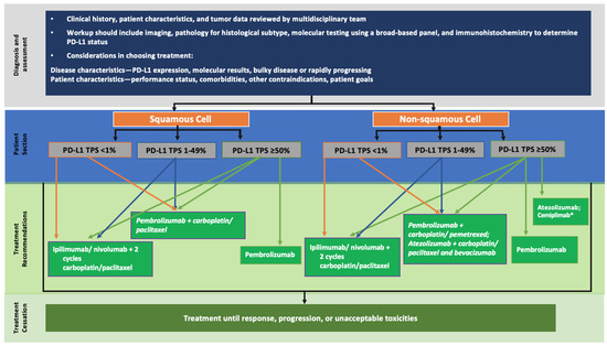 For patients with PD-L1 < 1%, treatment options shared by the US and the EU are pembrolizumab and chemotherapy in association regardless of the histology type [52,54], or atezolizumab–chemotherapy–bevacizumab only for non-squamous NSCLC [55] (Table 2). In the EU only, the combination of nivolumab, ipilimumab, and two cycles of chemotherapy for all PD-L1 expressions can be used [57].