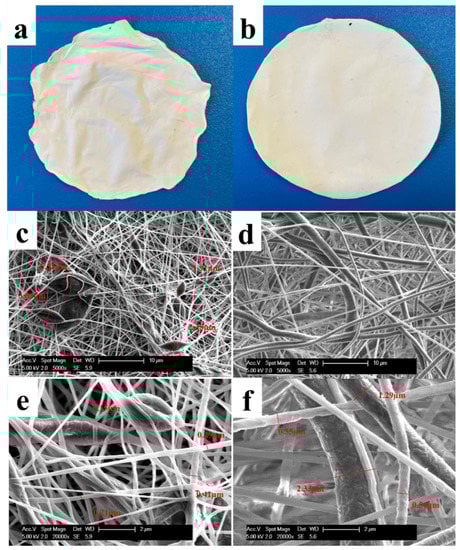The macroscopic appearances of (a) a 5% PCL membrane and (b) a 10% PCL membrane. The SEM images of (c) 5% PCL nanofibers and micro-beads observed at 5000× magnification with some of the micro-beads measured for the widths, (d) 10% PCL nanofibers at 5000× magnification, (e) 5% PCL nanofibers and micro-beads at 20,000× magnification with some of the fibers measured for the diameters, (f) 10% PCL nanofibers at 20,000× magnification with some of the fibers measured for the diameters.