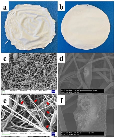 To evaluate the role of hydrophilic fillers, 5% CaCO3 NPs (to the weight of the solute) were electro-spun with 5% and 10% PCL solutions at the same spinning conditions. Calcium carbonate NPs were selected for this study as these particles have been widely proved to be feasible to incorporate with hydrophobic polymer fibers such as those made by PCL [24,25,26]. Figure 3a,b as well as Figure 2a,b shows that the addition of CaCO3 NPs had no impact on the macroscopic appearances of 5% and 10% membranes. A softer and more flexible texture has been found on the 5% membrane with NPs compared with that of the 10% membrane with NPs. After incorporated with the CaCO3 NPs, the 5% and 10% membranes showed no obvious changes in the fiber morphologies at 5000× magnification (Figure 3c,d compared with Figure 2c,d). A closer observation at 20,000×, however, revealed the different positions of the CaCO3 NPs incorporated with the corresponding fibers. As for the 5% fibers with NPs (Figure 3e), they had a rougher surface compared to the 5% fibers without NPs in Figure 2e. A similar rough surface was also created on the hydrophobic PAN nanofibers using the same NPs in the literature [27]. A number of fiber fragments with increased diameters (indicated by the red arrows in Figure 3e) emerged after the addition of the NPs, indicating that most of the NPs were covered on the surface of the 5% PCL nanofibers. Given that the size of the NPs (50 nm) is comparable to the diameters of the 5% fibers (averagely 230 nm showed in Table 1), the surface location of the NPs for 5% fibers is reasonable. The NPs incorporated in the 10% fibers, in contrast, aggregated to big clusters and comprised a part of the fibers (Figure 3f). A piece of literature using 12% PCL solution and a similar amount of CaCO3 NPs showed the same trend to our study with the NPs aggregating in the fibers [26]. A phase separation induced by the poor compatibilities of the hydrophobic fibers and hydrophilic NPs might be explained as the reason.