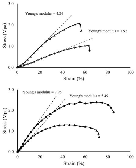 Stress–strain curves (n = 3) for: the 5% PCL membrane (○), 5% PCL membrane with CaCO3 NPs (△), 10% PCL membrane (●) and 10% PCL membrane with CaCO3 NPs (▲). The dashed lines are the trend of stress growth along with the increase of strain in the linear elastic region, indicating the Young’s modulus of each material.