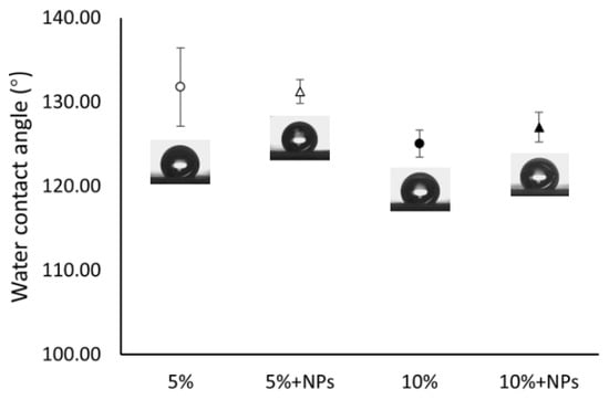 Contact angles of water droplets (n = 3) on membranes made using 5% and 10% PCL solution with or without NPs. The inserted figures under the error bars are the typical images of the drops on the corresponding nanofiber membranes.