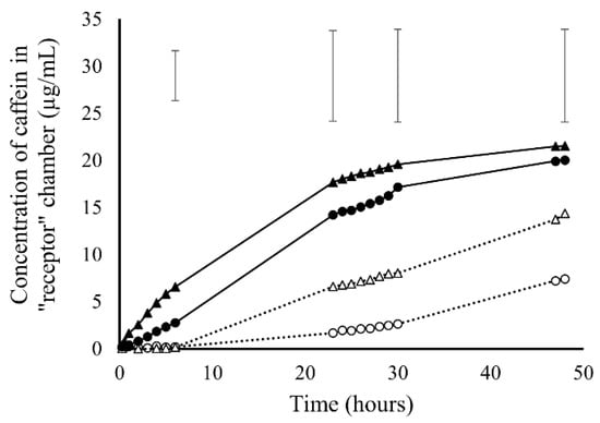Caffeine transport behaviors (n = 3) through the 5% PCL membrane (○), 5% PCL membrane with CaCO3 NPs (△), 10% PCL membrane (●) and 10% PCL membrane with CaCO3 NPs (▲). The error bars are the LSDs for the concentrations of caffeine after 6, 23, 30 and 48 h at a 95% confidence level.