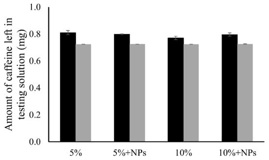 ) of caffeine left in the testing solutions after 48 h test for the 5% PCL membrane, 5% PCL membrane with NPs, 10% PCL membrane and 10% PCL membrane with NPs.
