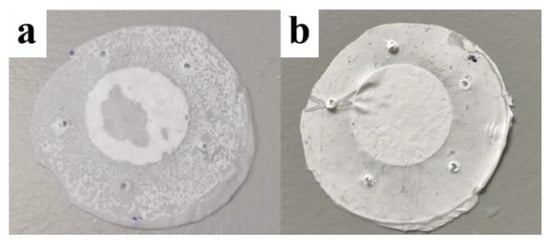 Based on the membrane characterization results in Section 3.2 and Section 3.4 where the impact of thickness and hydrophobicity on release behaviors has been removed, it is believed that the slower release rate of the 5% membranes is due to the 10-time smaller pore size compared to that of the 10% membranes (0.91 µm2 for the 5% membranes compared with 9.19 µm2 for the 10% membranes), which has given a higher transporting resistance and created a lower permeability for 5% membranes. A typical example for the wettability of the 5% and 10% membranes after 48 h transport experiments is shown in Figure 8 where a wetting zone can be seen on the surface of the 10% membrane (Figure 8a) while no wetting zone can be seen on the surface of the 5% membrane (Figure 8b).