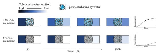 Based on all the results, we deduce that the difference in release profile between the 5% and 10% membranes resulted from different dominating release mechanisms. Figure 9 demonstrates what has happened on 5% and 10% membranes in our presumption. As for the 5% PCL membranes where wetting of the membranes is difficult, it is presumed that the release rate was increased with the expansion of the permeated areas. This type of release is mainly dominated by the permeability of nanofiber membranes. In contrast, the permeability of the 10% PCL membranes was so high that there was no significant impediment for the transport of the caffeine molecules. The molecules released according to the solute concentration gradient between the two sides of the membrane as the driving force. As the gradient decreased with time, the release rate dropped. This presumption is consistent with our observation in the molecular transport experiments where a positive relationship has been found between the concentration of caffeine in the “receptor” column and the area of wetted zone grown on membrane surface after 48 h. Unfortunately, the images of the wetted areas were not captured. Here, we propose a possible theory based on our understanding. In the same system as this experiment, as the pore size increased, the intrinsic permeability of the membrane increased leading to a transition of release rate from an accelerated style to a decelerated style with time. There should not be a critical value for the transition but a combined role with one driving factor (permeability or concentration gradient) dominating more than another based on the size of micro-structures. The accelerated and decelerated release styles changed with micro-structural dimensions might provide new opportunities for modulated or personalized pharmaceutical designs.