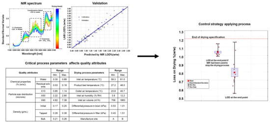 Roßteuscher-Carl et al. [222] and Reimers et al. [60] used an in-line SFV to monitor the particle-size distribution during fluid-bed granulation. The sapphire window of an SFV probe uses an internal compressed-air-supply system to prevent window contamination. After the SFV data is corrected through modeling and preprocessing, data evaluation is performed to verify the accuracy of monitoring. Factors such as the probe’s position and the binder spray speed must be properly controlled in the fluid-bed granulation process. Alcala et al., Kona et al., and Gavanet et al. measured moisture content by monitoring using an NIRS probe connected to a fluidized bed [223,224,225]. Spectrum data collected in real-time were preprocessed with SNV, MSC, first derivative, etc., and then analyzed with multivariate statistical tools, such as PCA, PLS, and MLR. The reference value was LOD, and after correcting and forming the prediction model, data evaluation through RMSEC and RMSEP proves the predictive ability and usability of NIRS. Rantanen et al. evaluated the granules’ moisture content and bulk-density characteristics by controlling the change of the inlet air condition through monitoring using NIRS during the granulation process [146]. In addition, it was confirmed that IQAs such as residual content and granule flowability of intermediate products affect hardness and weight, which are CQAs of finished products. The collected data were corrected through PLS modeling, and high accuracy was verified through low prediction errors. In other words, it shows that quality control can be continuously performed by introducing a PAT framework into the fluid-bed granulation process and controlling various IQAs and CPPs through real time monitoring.