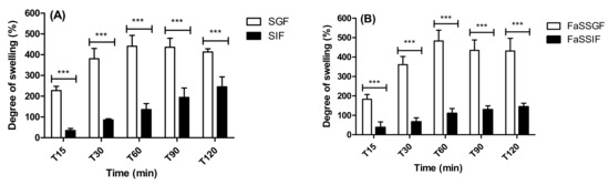 The swelling behaviour as indicated by weight changes of unloaded beads in (A) SGF/SIF and, (B) FaSSGF/FaSSIF. Data are presented as mean ± SD, asterisks indicate significance between the simulated fluids (A) between SGF and SIF, and (B) between FaSSGF and FaSSIF) at the respective time point. *** p > 0.001, (n = 3 batches).