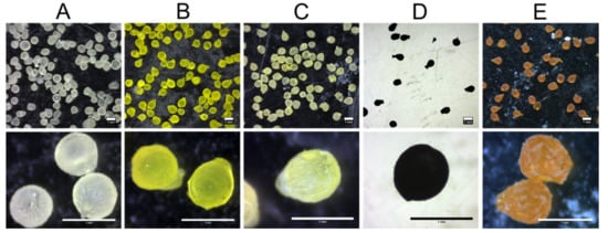 Stereo micrographs of (A) unloaded beads, and beads loaded with (B) SF, (C) FD4, (D) Fast Green, and (E) curcumin. Horizontal scale bars = 1 mm.