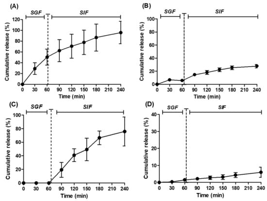 Release profiles in SGF and SIF from dWPI beads loaded with: (A) SF, (B) FD4, (C) Fast Green, and (D) curcumin. Vertical discontinuous bars indicate the switch of buffer from SGF to SIF. Each point represents the mean ± SD (n = 3 batches for all).