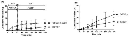 Release of curcumin from dWPI beads in: (A) SGF/SIF and FaSSGF/FaSSIF. Vertical discontinuous bar indicates switch of buffer from SGF/FaSSGF to SIF/FaSSIF, respectively. (B) FaSSIF + P and FaSSIF at 37 °C. Each point represents the mean ± SD (n = 3 batches).
