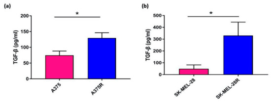 ELISA analysis of TGF-β1 produced by BRAFV600E mutated parent and vemurafenib-resistant melanoma cell lines. Results are expressed as the amount (pg/mL) of TGF-β1 produced by the same number of cells of (a) A375 and A375R, (b) SK-MEL-28 and SK-MEL-28R (* p < 0.05).