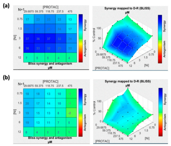 Combenefit mapped surface output for the drug combinations involving ARV and Ni using Bliss synergy model. ARV and Ni synergistically inhibit cell growth in a panel of (a) A375R and (b) SK-MEL-28R. Cells were treated with ARV and Ni in a 5 × 5 concentration grid for 48 h, cell viability was determined by MTT assay. The darker the blue color, the more predicted synergy between the drugs (n = 3).