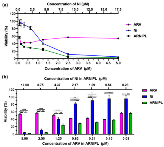 Cytotoxicity assay of ARV, Ni and ARNIPL in A375R. (a) % Cell viability with ARV, Ni and ARNIPL treatment in A375R. (b) The % viability comparison of ARV, Ni and ARNIPL at various concentrations. Data were plotted as mean ± SEM (n = 3). (* p < 0.05, ** p < 0.01, *** p < 0.001, **** p < 0.0001).