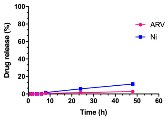 The result showed less than 2% of ARV and less than 5% of Ni was released in 24 h. After 48 h, the percentage release of both drugs increased but was within 5% for ARV and less than 10% for Ni at sink conditions (Figure 4), which indicated that ARNIPL did not show any burst release of ARV and Ni.
