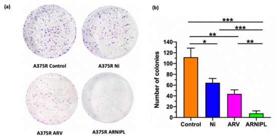 Colony forming ability of A375R after treatment with ARV, Ni and ARNIPL (a) Crystal violet staining images of A375R after various treatments. (b) Number of colonies with ARV, Ni and ARNIPL treatment and control in A375R. Number of colonies with ARNIPL treatment were significantly reduced compared to other groups (* p < 0.05, ** p < 0.01, *** p < 0.001).
