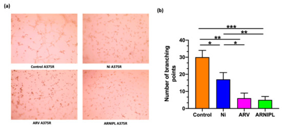 Melanoma vasculogenic mimicry was first described and characterized by Maniotis’ group, where the tube formation was distinct from endothelial cells [35]. The formation of vasculogenic mimicry was observed in A375R on the Matrigel. ARV and Ni inhibited vasculogenic mimicry at very low concentration as shown in Figure 6a. ARNIPL containing ARV and Ni showed further inhibition of vasculogenic mimicry compared to each individual drug. The number of branching points are plotted in Figure 6b, where ARV and ARNIPL both showed most significantly lower number of branching points (** p < 0.01, *** p < 0.001). There was no statistically significant difference between ARV and ARNIPL.