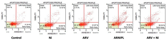 Flow cytometric apoptosis analysis in A375R treated with 3.5 μM Ni, 1 μM ARV, ARNIPL and ARV + Ni (3.5 μM Ni and 1 μM ARV) after 24 h treatment, ARNIPL showed higher apoptotic cell population compared with control.