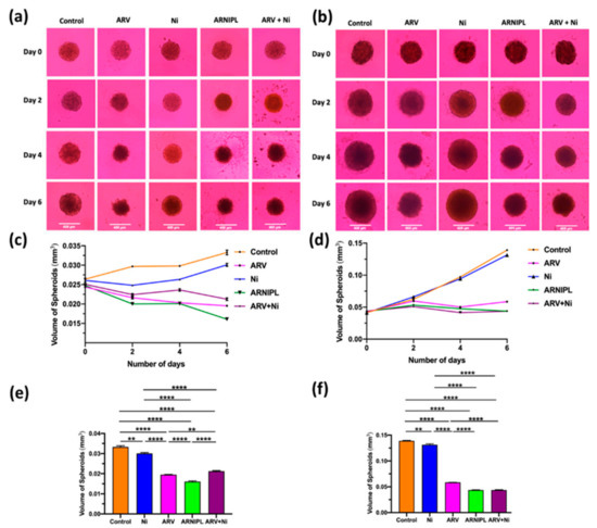 The effect of various treatments on A375R and A375R + Dermal Fibroblast co-culture 3D multicellular tumor spheroids growth. Spheroids were treated with control, 1 μM ARV, 3.5 μM Ni, ARNIPL and ARV + Ni (1 μM ARV and 3.5 μM Ni) (a) Bright field images of A375R spheroids with treatments on days 0, 2, 4, and 6. (b) Bright field images of co-culture spheroids with treatments on days 0, 2, 4, and 6. (c) Comparison of the volume of A375R spheroids. (d) Comparison of the volume of co-culture spheroids with various treatments at day 0, 4 and 6. (e) The volume of A375R spheroids on day 6. (f) The volume of co-culture spheroids on day 6. Significant difference in volume of spheroids was observed with ARV, Ni, ARNIPL and ARV + Ni compared to control. (** p < 0.01, **** p < 0.0001).