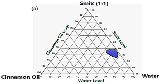 Cinnamon oil, surfactant (Pluracare L44 to PlurolOleique CC 497 in a ratio of 1:1), and co-surfactant (Capryol PGMC) were used to prepare the NE. The minimum CO concentration of 5% in NE formulations for antimicrobial activity has been already identified against some species [26]. Therefore, in this study, we aimed to obtained the highest possible range of CO concentrations above 5% for the optimization. The selection of surfactants and co-surfactants also has an immense role in the success of the NE formulation. Towards this objective, a combination of surfactants was planned instead of a single surfactant. Pluracare L44, a nonionic surfactant of poloxamer class, was one of the surfactants selected, and it has the ability to form both o/w and w/o emulsions. PlurolOleique CC 497 is a water-insoluble surfactant that helps in nanoemulsification. PlurolOleique CC 497 is particularly useful for the solubilization of poorly soluble drugs and thus is a good choice for the nanoemulsification of CO. Thus, a combination of Pluracare L44 and PlurolOleique CC 497 can be expected to provide the maximum benefit of each and result in a robust and stable NE formulation of CO. Capryol PGMC, chemically propylene glycol monocaprylate, is a solubilizer and surfactant for nanoemulsion formulations. It is suitable for lipid-based formulations and it was expected that its use as co-surfactant in CO-based NE would be appropriate. The surfactant and co-surfactant were mixed at different mass ratios (1:1, 2:1, 3:1, 4:1, 1:2, 1:3, and 1:4) to prepare the Smix. Different combinations of oil and Smix were made so that the maximum ratios were covered in order to precisely delineate the boundaries of the phases formed in the phase diagrams. The pseudo-ternary-phase diagrams of the oil, Smix, and water were developed using the aqueous titration method. Various combinations were identified to study the NE region in the generated pseudoternary-phase diagram.