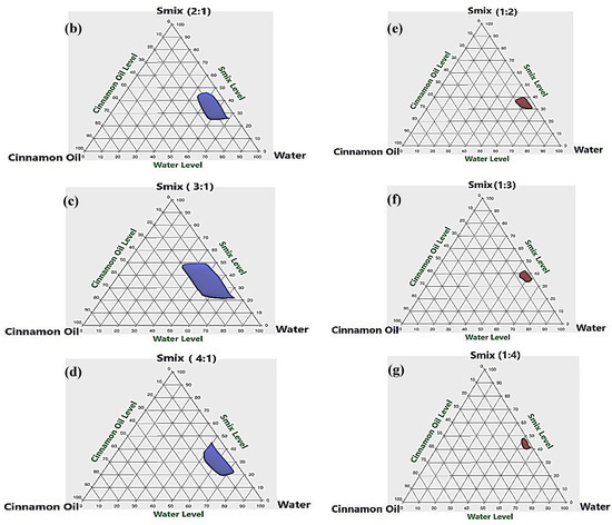 Pseudoternary-phase diagram constructed for the identification of the nanoemulsion region using cinnamon oil (CO), surfactant (Pluracare L44 and Plurol Oleique CC 497 in a ratio of 1:1), and co-surfactant (Capryol PGMC) at different surfactant and co-surfactant mixture (Smix) ratios: (a) Smix 1:1, (b) Smix 2:1, (c) Smix 3:1, (d) Smix 4:1, (e) Smix 1:2, (f) Smix 1:3, and (g) Smix 1:4.