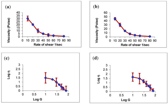 Plots of the shear rate (G) versus the viscosity (η) with a normal scale and with a logarithmic scale. (a,c) for plain hydroxypropyl cellulose (HPC) hydrogel (G4) and (b,d) for HPC hydrogel loaded with optimized CO-NE (NEG1). Values are expressed as the mean ± SD (n = 3).