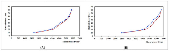 A plot showing the log shear rate versus the log shear stress was obtained for both samples (Figure 5). Farrow’s constant, the slope of these plots, was determined for both samples. A Farrow’s constant value greater than one confirms a shear-thinning system [43]. Thus, it was found that both samples had Farrow’s constant values greater than one. The Farrow’s constant values were 2.2994 and 2.3601 for the G4 and NEG1 samples, respectively. Thus, only a slight increase in pseudoplastic behavior can be expected from the NEG1 sample.
