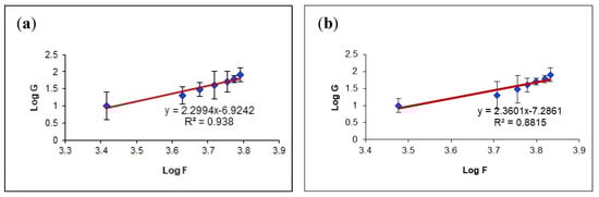 Plots of the logarithm of the shear rate (G) versus the logarithm of the shear stress (F) for (a) plain HPC hydrogel (G4) and (b) HPC hydrogel loaded with optimized CO-NE (NEG1). Values are expressed as the mean ± SD (n = 3).