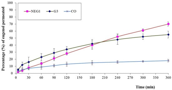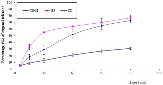 The in vitro release of eugenol (marker molecule for CO) from NEG1 was studied in comparison with the G3 and CO samples. The results (Figure 6) showed a significant increase in dissolution compared with pure CO. This significant increase in the percentage of eugenol from the NE formulation could be due to the presence of oil in the nanosize range within the formulation, and the presence of surfactants and cosurfactants within the NE may have enhanced the solubilization of oil within the dissolution media. A nanoemulsion formulation has already been reported to enhance the solubility and dissolution of essential oils due to the presence of surfactants and co-surfactants and a small droplet size [17]. Moreover, pure CO is poorly soluble and immiscible with the dissolution medium. Therefore, the observation of the very high dissolution and release of eugenol can be justified. Meanwhile, a sustained release of eugenol was observed from NEG1 in comparison with the G3 sample. This sustaining in the release of eugenol from NEG1 could be due to the viscosity of the HPC gel base, which could retard the release compared with the aqueous dispersion of NE, which enhanced the solubility and dissolution of the essential oil but could not sustain its release. Obviously, the conversion of an NE to an NEG using a gelling agent provided a diffusion barrier for the drug release, leading to a sustained or controlled drug release [44]. Such an effect could be the reason for the sustained release of eugenol (and, thus, CO) from NEG1.