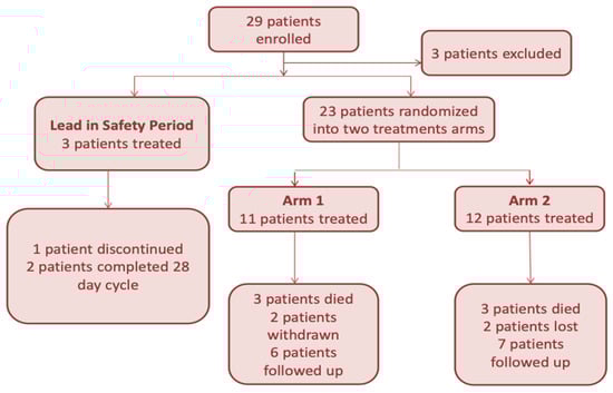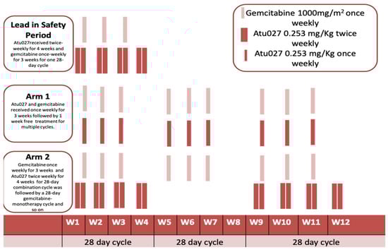 Atu027 is a siRNA-based lipid nanoparticle that has the ability to knockdown the expression of protein kinase N3 (PKN3). Elevated PKN3 expression is associated with enhanced angiogenesis and tumor metastasis; consequently, silencing PKN3 expression leads to the inhibition of angiogenesis and tumor invasion [33,34]. A phase I clinical trial investigation of on Atu027, via a cationic lipoplex nanocarrier known as AtuPLEX, was developed by Silence Therapeutics for patients with advanced solid tumors. Atu027 was administered intravenously on 24 patients at doses of up to 0.18 mg/kg. Two patients experienced either disease stabilization or pulmonary metastasis regression; the patients were further treated with Atu027 until the cancer became progressive. The phase I trial was completed with no DLTs [35,36]. Atu027 response was significantly greater in patients with pancreatic neuroendocrine tumor [37]; therefore, a phase Ib/IIa trial was launched in 2013 to investigate the safety-efficacy profile of Atu027 in combination with gemcitabine in advanced pancreatic adenocarcinoma patients (Figure 2). Twenty-nine patients were randomly enrolled into two different Atu027 schedules. In one group, patients were treated with Atu027 and gemcitabine once weekly for three weeks; patients in the second group were treated with gemcitabine once weekly and Atu027 twice weekly for three weeks followed by one drug-free week (Figure 3). The 28-day cycle was repeated until the appearance of significant toxicities or disease progression. Phase Ib/IIa revealed that both regimens were well tolerated and the twice-weekly dosing superseded the once-weekly dosing [38].