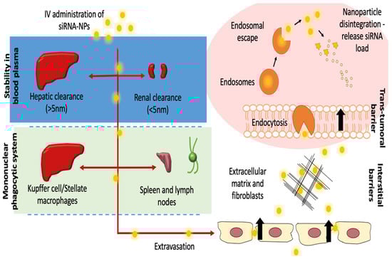 Physiological barriers to in vivo delivery of siRNA-nanoparticles. Extracellular barriers include hepatic and renal clearance, which are dependent on the particle sizes. Opsonization and macrophage engulfment via the mononuclear phagocytic system (MPS) further reduce the bioavailability of siRNA nanoparticles in the plasma. Extracellular matrix (ECM) trapping further decreases the localization of siRNA complexes into the tumor tissues. Intracellular barriers involve effective endosomal escape and siRNA release into the cytosol to initiate RNAi-associated gene knockdown activity.