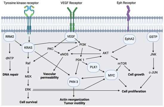 Simplified signaling cascade of selected genes for cancer therapy in clinical trials. Created with BioRender.com.