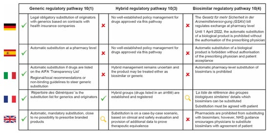 Cross-country comparison of hospital pharmacy substitution policies for generic, hybrid and biosimilar drugs in five European countries [29,30,31,32,33,34]. AIFA = Italian Medicines Agency; NHS = National Health Service.