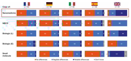 This quantitative market research, supplemented by qualitative data from an initial pilot study, demonstrates that the vast majority of hospital pharmacists interviewed from France, Germany, Spain and Italy expect no or negligible differences between nanomedicines and their follow-on products. Pharmacists in the UK were an exception, with over 50% stating that they expected notable differences between nanomedicines and their follow-on products. The qualitative research suggested that this may be due to perceptions around the complexity of nanomedicines and structural differences between originator and their follow-on products. Nonetheless, this research also suggested that pharmacists did not consider any differences to be significant or relevant to outcomes.