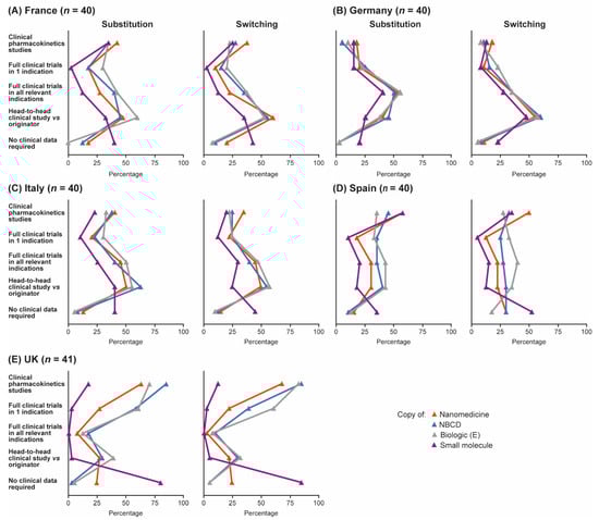 Data pharmacists would be required in order to be able to substitute a reference product for a follow-on in the hospital formulary, or to be able to switch prescriptions on a given patient. Data are shown by country: (A) France, (B) Germany, (C) Italy, (D) Spain and (E) UK. Source question: For each of the following branded drugs, please again imagine that a copy was to become available in your country. Please now imagine that your institution was to include BOTH the originator and the copy in the formulary (even if this may not be standard practice). What clinical data would your institution require in order to substitute the originator for the copy in your formulary/demand in order to be able to switch prescriptions freely between the branded originator and the copy, even within the same patient? (Choose as many options as required.) E = Enbrel® (etanercept), NBCD = non-biologic complex drug.