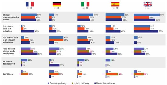 Overall, head-to-head clinical trial data for originator versus follow-on were perceived to be required most for products approved via the biosimilar pathway (39%), with 29% and 27% believing head-to-head data were needed for products approved via the generic and hybrid pathways, respectively. Responses were generally similar by country. In total, 28% of pharmacists stated that they did not know the data requirements for the hybrid pathway, compared with 8% and 2% for the generic and biosimilar pathways, respectively.