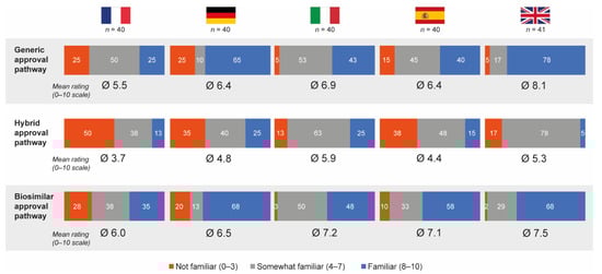 Consistent with this and irrespective of country, hospital pharmacists were considerably less familiar with the hybrid approval pathway than both the generic and biosimilar approval pathways. Overall, around half of the pharmacists surveyed felt they were familiar with the generic and biosimilar pathways, while only 16% were familiar with the hybrid pathway. Familiarity was likely higher with the generic pathway as it is well-established, based on decades of research and experience. Pharmacist experience with the biosimilar pathway is increasing as more biosimilar therapies become available. In contrast, the hybrid pathway is relatively unknown. Italian pharmacists had the highest average familiarity ratings for the hybrid pathway, which may be due to a recent court case in Italy regarding substitution of glatiramer acetate, a product that was approved via the hybrid pathway, bringing this issue into the public eye [35].