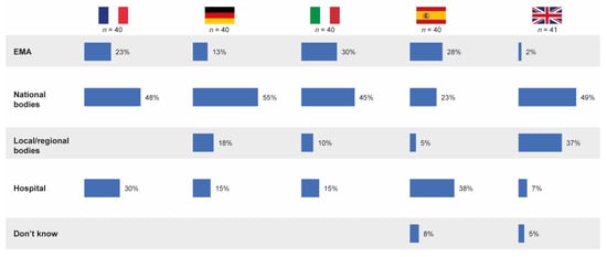 Overall, almost one in five pharmacists (19%) believed the EMA to be responsible for defining whether a follow-on medicinal product is substitutable with its reference product in the hospital formulary, irrespective of its approval pathway. However, 44% of pharmacists believed national bodies to be responsible for defining substitution rules and 21% thought the hospital was responsible. In most participating countries, the highest proportion of hospital pharmacists believed that national bodies defined whether a follow-on is substitutable; however, in Spain, 38% of pharmacists believed this decision was taken by the hospital (Figure 7).