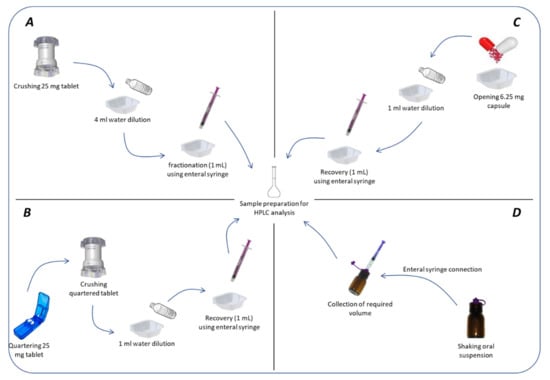 Tablets: According to the literature [,], two methods were applied to simulate the administration of tablets to neonates. The first consisted of crushing the whole tablets with a specific crushing device (Pilldrink®, Inresa, Bartenheim, France). The obtained powder was mixed with 4 mL of drinking water and a fraction of the obtained suspension was collected with a 1 mL enteral syringe (Asept InMed, Quint-Fonsegrives, France). The volume was then put into a volumetric flask to mimic child administration. The second method consisted of quartering tablets with a cutting device (Merk, Semoy, France) and crushing them separately with the crushing device used above. Again, the obtained powder was mixed with drinking water and the obtained suspension was put into a volumetric flask with a 1 mL enteral syringe to mimic administration and to allow API dilution. For each method, 30 tablets were assessed (n = 30).