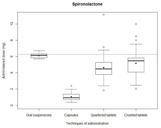 Spironolactone: After simulating administrations, the mean recovered dose was 4.62 ± 1.38 mg and 5.17 ± 1.52 mg with quartered and crushed tablets, respectively, 1.05 ± 0.48 mg with capsules and 6.11 ± 0.30 mg with oral suspensions. Mean recovered doses obtained with capsules, quartered tablets and crushed tablets were significantly different from the theoretical dose (p < 0.01), while mean recovered dose obtained with oral suspensions showed no significant difference (p = 0.70). Distributions of analyzed samples are shown in Figure 2. The narrowest distribution was observed with oral suspensions while the widest was observed with crushed tablets. The Kruskal–Wallis test showed a significant difference between the four administration modality dose distributions (p < 0.01). Mann–Whitney testing between in pair distributions likewise assessed significant differences (p < 0.01). The smallest difference was observed between quartered and crushed tablets (p = 0.009).