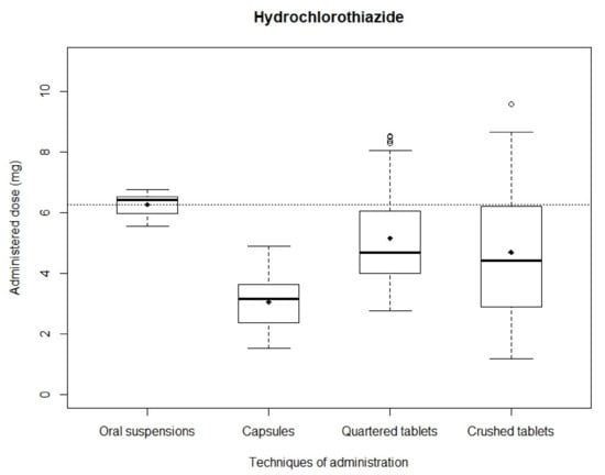 Hydrochlorothiazide: After simulating administrations, the mean recovered dose was 4.19 ± 0.96 mg and 5.47 ± 0.85 mg with quartered and crushed tablets, respectively, 3.05 ± 0.84 mg with capsules and 6.26 ± 0.35 mg with oral suspensions. Mean recovered doses obtained with capsules, quartered tablets and crushed tablets were significantly different from the theoretical dose (p < 0.01) while mean recovered dose obtained with oral suspensions showed no significant difference (p = 0.67). Distributions of analyzed samples are shown in Figure 3. The narrowest distribution was observed with oral suspensions while the widest was observed with crushed tablets. The Kruskal–Wallis test showed a significant difference between the four administration modality dose distributions (p < 0.01). Mann–Whitney testing between in pair distributions also assessed significant differences (p < 0.01) except between quartered and crushed tablets (p = 0.28).
