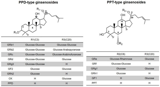Structure of 20(S)-protopanaxadiol- and 20(S)-protopanaxatriol-type ginsenosides. Compound K, CK; protopanaxadiol, PPD; protopanaxatriol, PPT.