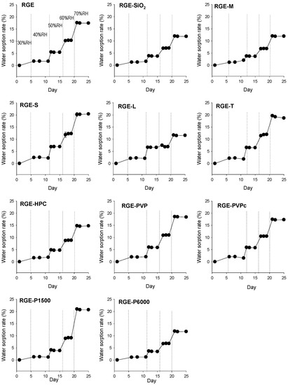 The effect of humidity (from 30% RH to 70% RH) on the water sorption rate of solid dispersion of red ginseng extract (RGE) stored in a thermo-hygrostat at 30 °C. Data represent the mean ± standard deviation (n = 3). RGE: solid dispersion of red ginseng extract; RGE-SiO2: solid dispersion of RGE with silicon dioxide; RGE-M: solid dispersion of RGE with mannitol; RGE-S: solid dispersion of RGE with sucrose; RGE-L: solid dispersion of RGE with lactose; RGE-T: solid dispersion of RGE with trehalose; RGE-HPC: solid dispersion of RGE with hydroxypropyl cellulose; RGE-PVP: solid dispersion of RGE with polyvinyl pyrrolidone; RGE-PVPc: solid dispersion of RGE with cross-linked polyvinyl pyrrolidone; RGE-P1500: solid dispersion of RGE with PEG1500; RGE-P6000: solid dispersion of RGE with PEG6000.