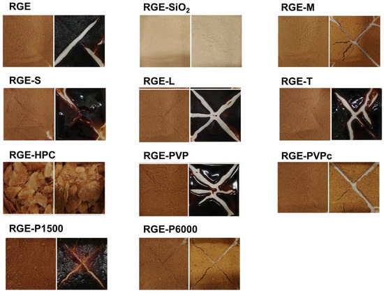 Hygroscopic evaluation of the solid dispersion of red ginseng extract (RGE) with various hydrophilic carriers before (left) and after (right) storing in a thermo-hygrostat incubator with increasing humidity (from 30% RH to 70% RH) for 25 days at 30 °C. RGE: solid dispersion of red ginseng extract; RGE-SiO2: solid dispersion of RGE with silicon dioxide; RGE-M: solid dispersion of RGE with mannitol; RGE-S: solid dispersion of RGE with sucrose; RGE-L: solid dispersion of RGE with lactose; RGE-T: solid dispersion of RGE with trehalose; RGE-HPC: solid dispersion of RGE with hydroxypropyl cellulose; RGE-PVP: solid dispersion of RGE with polyvinyl pyrrolidone; RGE-PVPc: solid dispersion of RGE with cross-linked polyvinyl pyrrolidone; RGE-P1500: solid dispersion of RGE with PEG1500; RGE-P6000: solid dispersion of RGE with PEG6000.