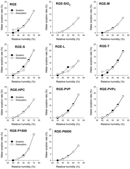 Water sorption–desorption rate curves of solid dispersion formulations of red ginseng extract (RGE) stored in a thermo-hygrostat with increasing relative humidity (from 30% RH to 70% RH; ●) and decreasing relative humidity (from 70% RH to 30% RH; ○) at 30 °C. Data represent the mean ± standard deviation (n = 3). RGE: solid dispersion of red ginseng extract; RGE-SiO2: solid dispersion of RGE with silicon dioxide; RGE-M: solid dispersion of RGE with mannitol; RGE-S: solid dispersion of RGE with sucrose; RGE-L: solid dispersion of RGE with lactose; RGE-T: solid dispersion of RGE with trehalose; RGE-HPC: solid dispersion of RGE with hydroxypropyl cellulose; RGE-PVP: solid dispersion of RGE with polyvinyl pyrrolidone; RGE-PVPc: solid dispersion of RGE with cross-linked polyvinyl pyrrolidone; RGE-P1500: solid dispersion of RGE with PEG1500; RGE-P6000: solid dispersion of RGE with PEG6000.