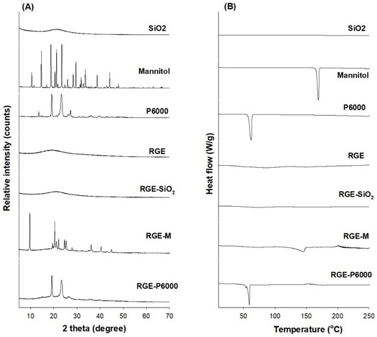 (A) The X-ray diffraction patterns and (B) the differential scanning calorimetry thermograms of SiO2, mannitol, P6000, red ginseng extract (RGE), RGE-SiO2, RGE-M, and RGE-P6000.