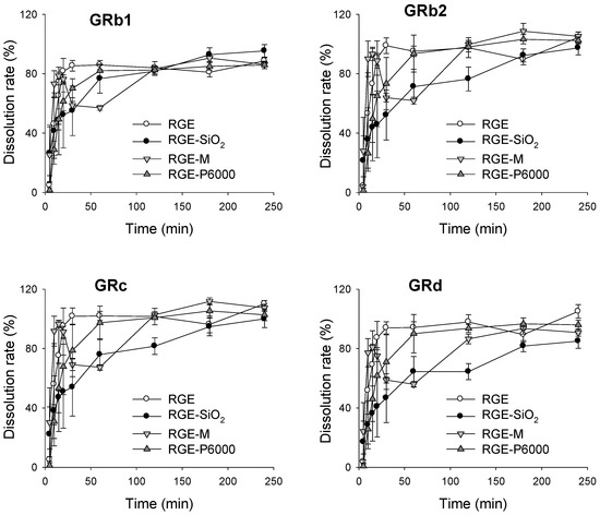 Dissolution profiles of ginsenoside Rb1 (GRb1), GRb2, GRc, and GRd from the solid dispersions of red ginseng extract (RGE), RGE-SiO2, RGE-M, and RGE-P6000 were measured using the paddle method for 240 min. Data represent the mean ± standard deviation (n = 3).